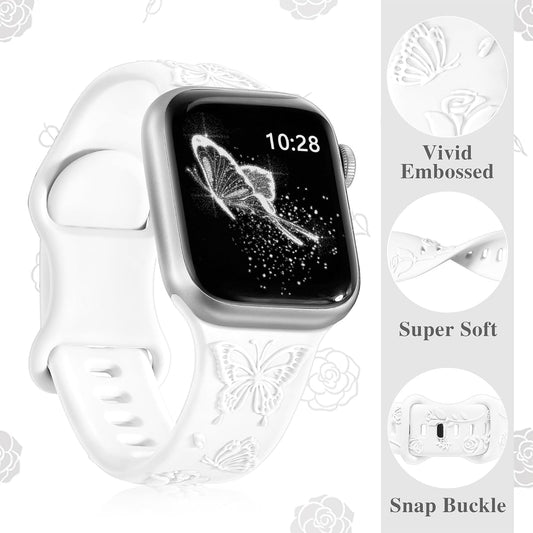 Floral Butterfly Engraved Band Compatible with Apple Watch Bands for Women 40Mm 41Mm 38Mm, Soft Silicone Sport Iwatch Bands for Apple Watch Series 9 Band SE Series 8 7 6 5 4 3 2 1-White