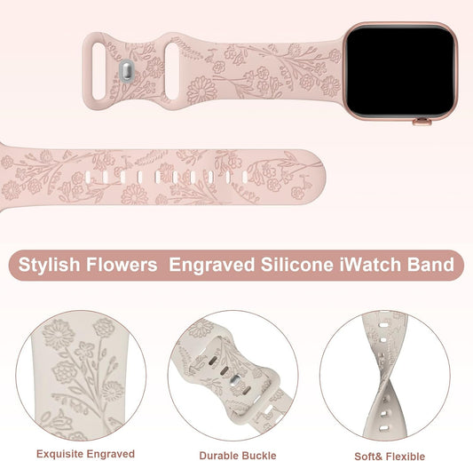 2 Pack Floral Engraved Band Compatible with Apple Watch Bands 38Mm 40Mm 41Mm for Women, Cute Wildflowers Design Soft Silicone Sport Strap Replacement Wristbands for Iwatch Series 9/8/7/SE/6/5/4/3/2/1