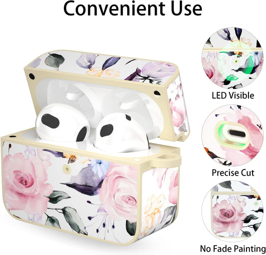 Yelovehaw for Airpods 3 Case for Women Girls, Pink Rose Floral & Purple Leaves Pattern, Full Body Protective Cute Cover with Wrist Strap for Airpods 3Rd Generation Charging Case (Flowers - White)