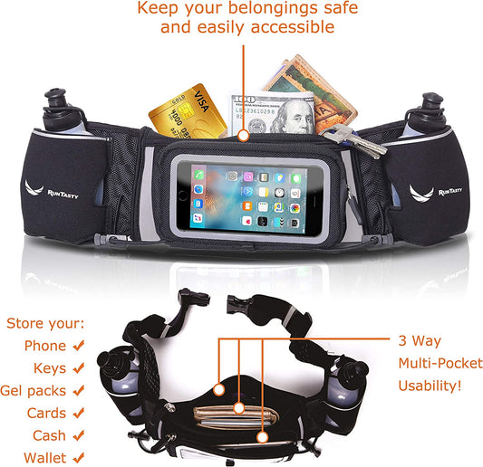 [Voted No.1 Hydration Belt] Runtasty Winners' Running Fuel Belt - Includes Accessories: 2 BPA Free Water Bottles & Runners Ebook - Fits Any Iphone - W/Touchscreen Cover - No Bounce Fit and More!