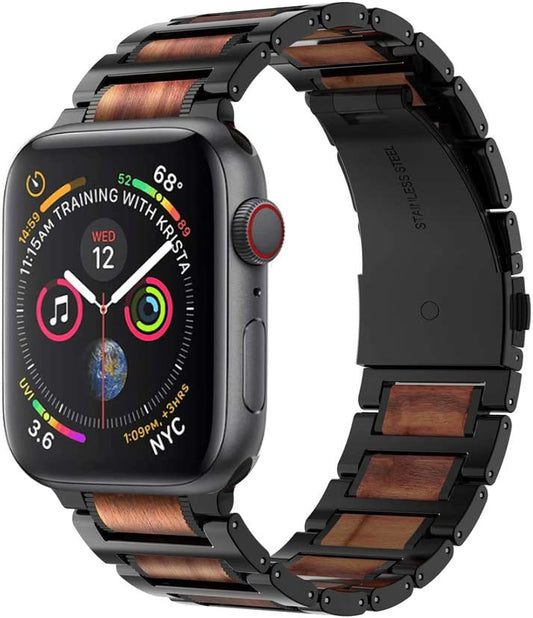 Iiteeology Compatible with Apple Watch Band 49Mm 45Mm 44Mm 42Mm, Natural Wooden Stainless Steel Link Bracelet Strap for Apple Watch Ultra & SE Series 8 7 6 Series 5 4 3 2 1 - Black