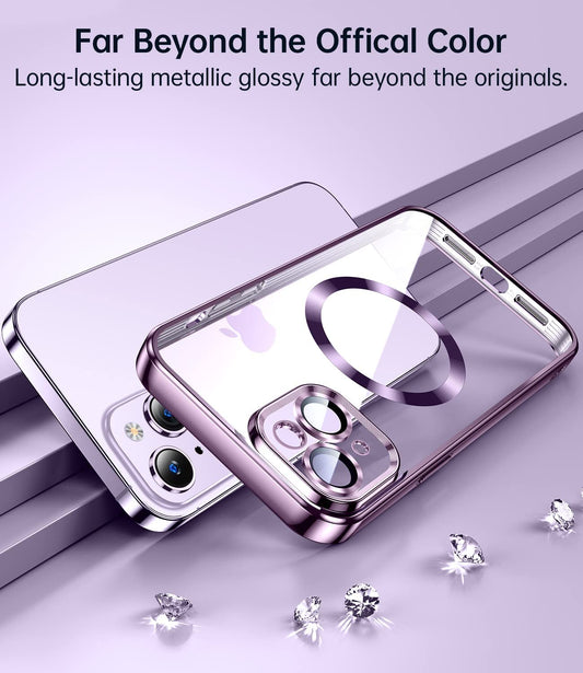 JUESHITUO Magnetic Matallic Glossy Clear for Iphone 14 Case with Full Camera Cover Protection [No.1 Strong N52 Magnets] [Military Grade Drop Protection] for Women Girls Phone Case (6.1")-Purple