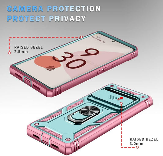 Google Pixel 6 Pro Case with Slide Camera Cover&Card Slot& Ring Kickstand Shockproof Military Grade Heavy Duty Protective Case Support Car Magnetic Holder for Google Pixel 6 Pro(2021)-Green/Pink