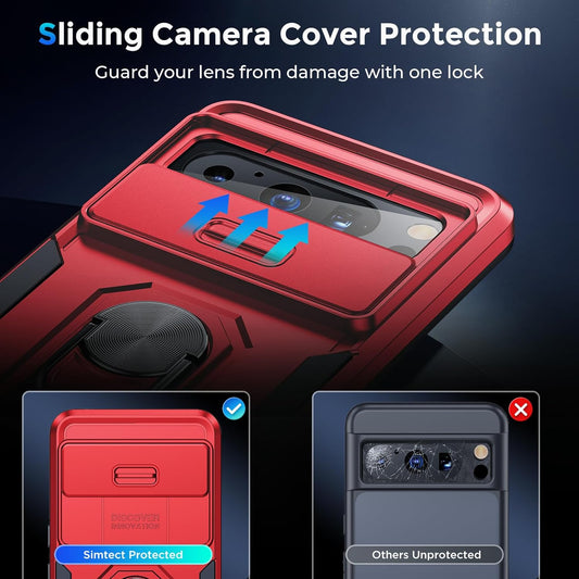 Simtect for Google Pixel 8 Pro Case with Camera Cover: 14FT Military Grade Shockproof, 360° Rotation Ring Stand, Double Layer Cushioned Lens Guard, Full Coverage Case for Pixel 8 Pro, 6.7" Red