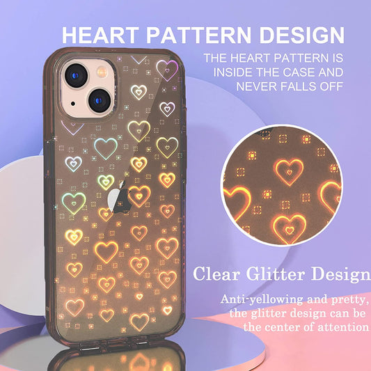 Tksafy Case Compatible Iphone 14 Case, Clear Glitter Cute Laser Holographic Love Heart Pattern for Women Girls, Anti-Yellow Hard PC Protective Phone Cover for Iphone 14 6.1-Inch 2022, Light Black