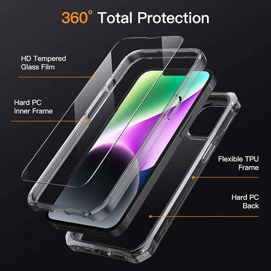 Jetech Case for Iphone 14 plus 6.7-Inch with 2-Pack Tempered Glass Screen Protector, 360 Full Body Shockproof Bumper Phone Cover Protective Clear Back (Clear)