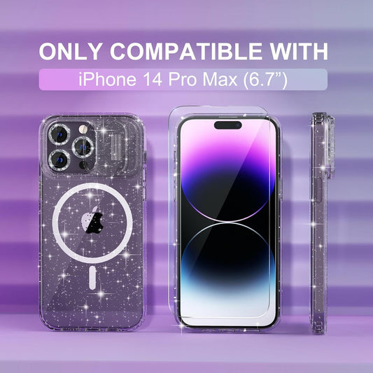 Choiche Magnetic Case for Iphone 14 Pro Max Case, Women Clear Glitter Sparkly Case, [Slide Camera Cover & 3 Diamond Camera Lens Protectors & 2 Screen Protectors] [Compatible Magsafe] (Glitter Clear)