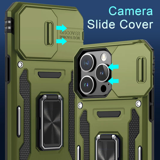 DEERLAMN for Iphone 14 Pro Max Case with Slide Camera Cover+Screen Protector(1 Pack),Rotated Ring Kickstand Military Grade Shockproof Protective Cover 6.7 Inch-Olive Green