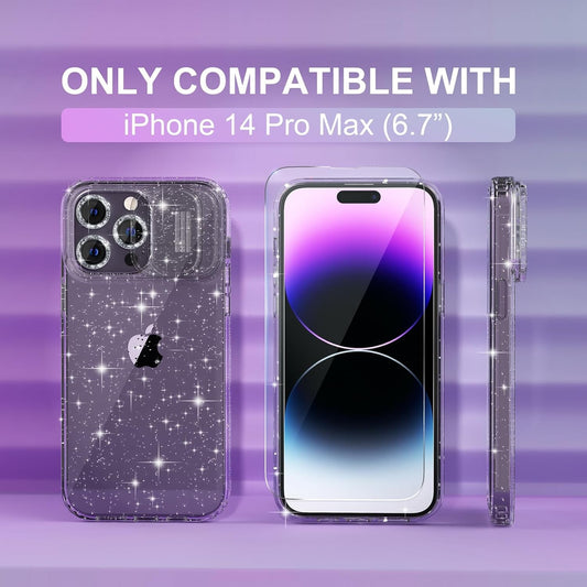 Choiche for Iphone 14 Pro Max Case Cute, Women Clear Glitter Bling Sparkly Case, [Slide Camera Cover & 3 Diamond Camera Lens Protectors] [2 Tempered Glass Screen Protectors] 6.7-Inch (Glitter Clear)