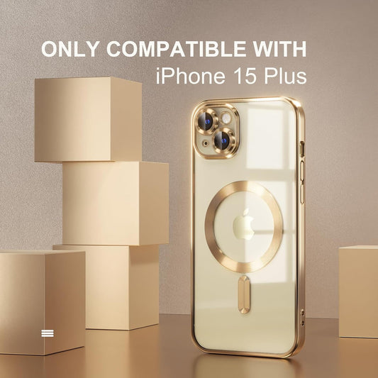 Misea Magnetic for Iphone 15 plus Case Compatible with Magsafe [Never Yellowing] [Military Grade Drop Protection] Full Camera Lens Protector Plating Soft Clear Phone Case for Women Girls, Gold
