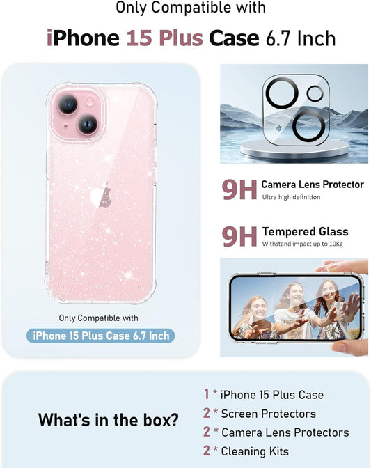 MIODIK for Iphone 15 plus Case, with 2Pcs Screen Protectors + 2Pcs Camera Lens Protectors, [Not Yellowing] Clear Glitter Phone Case, Protective Shockproof Women Girls Cover - Sparkle Clear