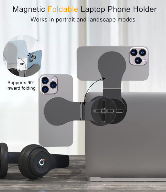 Jkoailiwi Foldable Magnetic Cell Phone Holder for Laptop, 180° Adjustable Magsafe Laptop Phone Mount, Slim Portable Computer Phone Mount Compatible with Iphone 14/13/12 Pro plus Max Mini