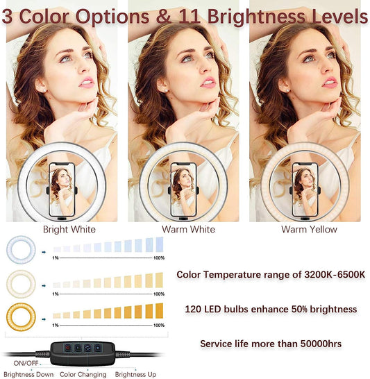 10" Selfie Ring Light with Tripod Stand & Cell Phone Holder, Dimmable Desktop LED Circle Light for Youtube Video/Live Stream/Makeup/Photography for Iphone Android