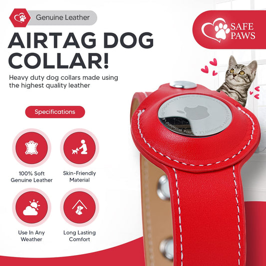 Safe Paws Genuine Leather Airtag Collar for Dogs & Cats - Made with Real Leather Our Heavy Duty Airtag Dog Collar Is Durable & Breathable - Airtag Collars for Small Medium & Large Dogs (Red, S)