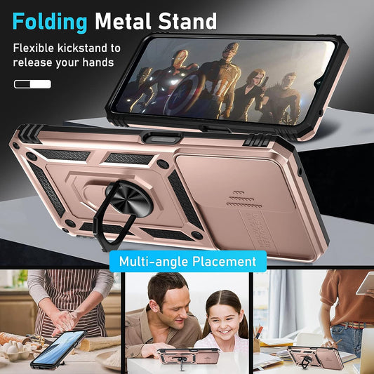 Oneplus Nord N300 5G Case Built in Slide Camera Lens Cover and Screen Protector,Heavy Duty Shockproof Full Body Protective Phone Cover,Built in Finger Ring Stable Holder Kickstand,2022 Rose Gold