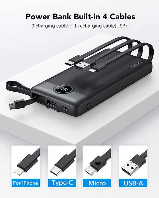 Portable Charger with Built in Cables,Vrurc 10000Mah Ultra Slim USB C Power Bank,5 Output 2 Input LED Display External Battery Pack Phone Charger Compatible with Smart Devices and Cell Phones(1 Pack)