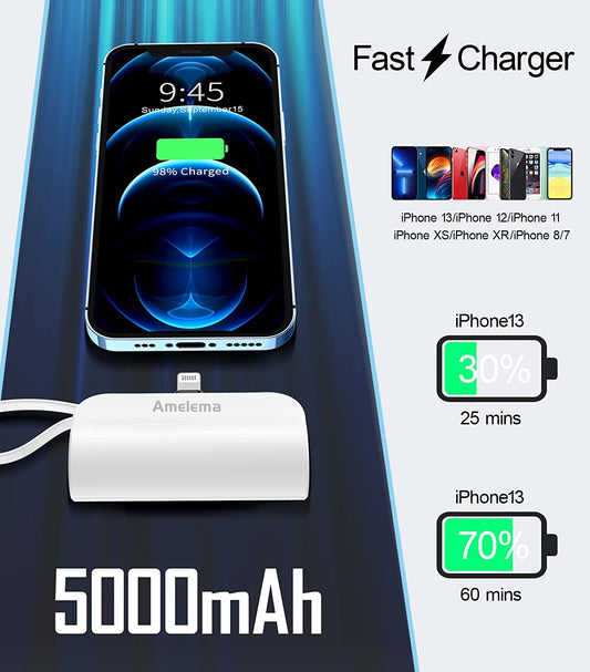 Slim Portable Charger 5000Mah - Compact Mini Small Power Bank Built-In Cable Cute Mobile Cell Phone External Battery Pack 5V 2.1A USB-C Compatible with Iphones 6/7/8/X/XS/XR/11/12/13/14 Airpods