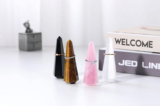 Jovivi Crystal Ring Holder Tower Natural Rose Quartz Crystal Stone Jewelry Ring Display Holder Hexagon Prism Shaped Decorative Wedding Ring Display Stand Finger Ring Storage