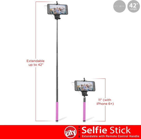 Circuit City Wired Extendable Selfie Stick with Remote Control Handle Extra-Long 42” Extending Monopod with Lanyard Steel Telescoping Phone Holder for Iphone 6, 5, 4, Samsung S6, S5 & More (Pink)