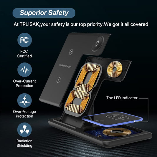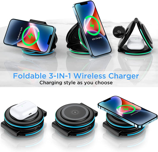 Wireless Charging Station, 3 in 1 Foldable Fast Wireless Charger Pad [Compatible with Magsafe Charger] for Iphone 14/Pro/Max/Plus/13/12 Series, Airpods 3/2/Pro, Apple Watch/Iwatch - Black