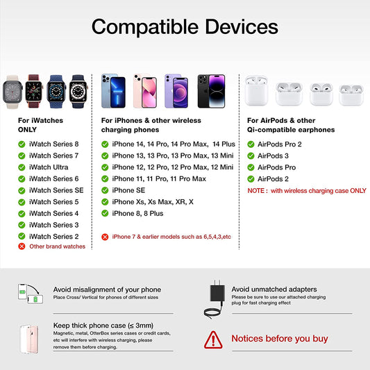 Wireless Charger 3 in 1 for Iphone/Iwatch/Airpods Devices, Charging Station for Iphone 14/13/12/11/Pro Max/Se/X/Xs/Xr/8, Multi Charger Stand for Apple Watch Iwatch 8/7/6/SE/5/4/3/2, Airpods 3/Pro/2