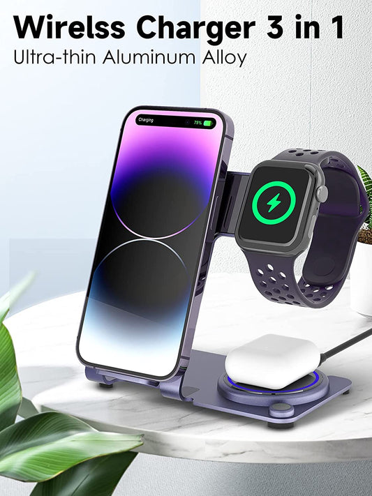 Wireless Charger 3 in 1,Aluminum Alloy Wireless Charging Station 18W Fast Charging for Iphone 14/13/12/11/Pro/Max/Xs/Xr/X/8, Iwatch8/7/6/5/4/3/2/Se, Airpods Pro/3/2/1(Purple)