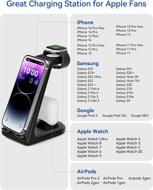 Charger Station for Apple Multiple Devices, 3 in 1 Fast Wireless Charging Dock Stand for Apple Watch 8 7 6 SE 5 4 3 2 Iphone 14 13 12 11 Pro X Max XS XR 8 7 plus 6S 6 Airpods 1 2 3 Pro with Adapter