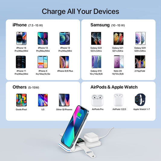 Wireless Charger, 3 in 1 Fast Charging Station, Folding Travel Wireless Charger Stand for Iphone 14,13,12,11/Pro/Max/Plus, X,XR, Xs/Max,Se, 8/Plus,Apple Watch 1-8,Airpods 3/2/Pro 18W Adapter(White)