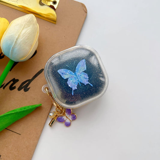AOLABOKY Kopfhörer-Hülle für Samsung Galaxy Buds Live/Buds Pro/Buds 2/Buds2 Pro Ladebox, schöner Schmetterling, glänzend, transparent, Headset-Schutzhülle mit Schlüsselanhänger (lila)