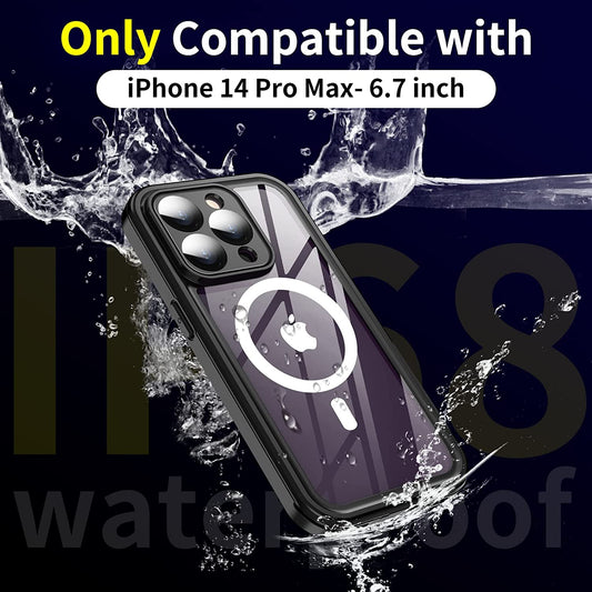 MOZOTER Schutzhülle für iPhone 14 Pro Max, wasserdicht, integrierter 9H-Displayschutz aus gehärtetem Glas, [real 360], IP68 unter Wasser, 3,6 m militärisch, sturzsicher, staubdicht, kompatibel mit Magsafe, Schwarz/Klar