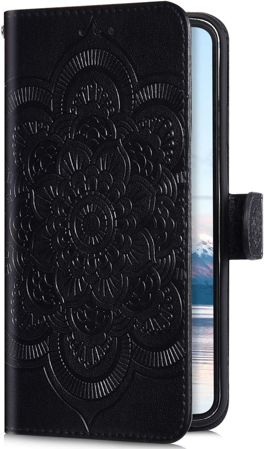 IKASEFU Kompatibel mit LG V40 Thinq Hülle, geprägtes Sonnenmandala-Blumenmuster, Pu-Leder, Brieftaschengurt, Kartenfächer, stoßfest, magnetischer Standfunktion, Folio-Flip-Book-Cover, Schutzhülle, Schwarz