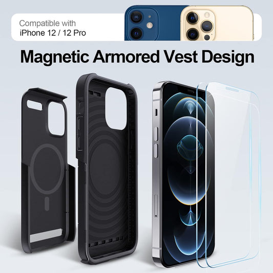 Elando stoßfeste magnetische Hülle für iPhone 12 Hülle/iPhone 12 Pro Hülle, [kompatibel mit Magsafe] [2 Stück Displayschutzfolien], robuste Schutzhülle, schwarz