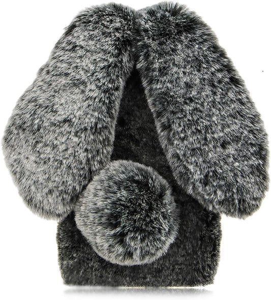 LCHDA Kaninchen-Hülle für Oneplus Nord N200 5G, niedliche 3D-Hasenohren, weich, pelzig, Haarball, flauschig, warm, Winter, Kunstfell, Plüsch, flauschig, flexibler TPU-Stoßfänger, Damen und Mädchen, schützende Hauthülle – Schwarz