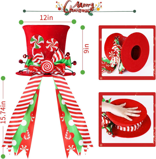 Zylinder Weihnachtsbaumspitze, Roter Filzzylinder Weihnachtsbaumspitze mit gestreifter Schleife und Lutscher, Weihnachtsbaumschmuck Zylinder