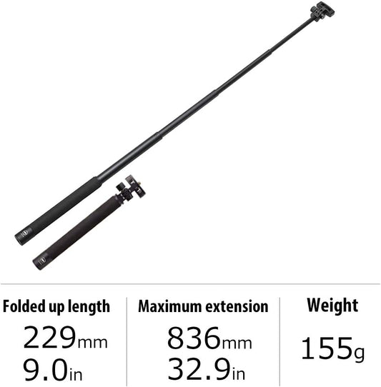 RICOH THETA Stick TM-2 Selfie-Stick für alle neigbaren Kameraplattformen der THETA-Serie. Maximale Ausdehnung 32,9 Zoll. Minimale Höhe 9 Zoll. Aluminiumrohr. Bequemer, mattierter Gummigriff. 1/4-Schraubgewinde