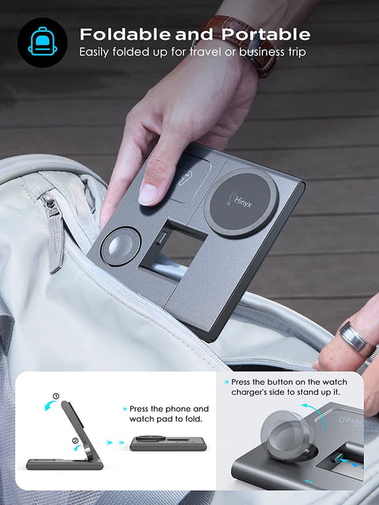 3-in-1-Schnellladegerät, faltbar, magnetisch, kabelloses Ladegerät, Magsafe-Ladeständer für iPhone 14/13/12-Serie, Iwatch 8-2, Airpods 3/2/Pro (mit QC 3.0-Adapter)