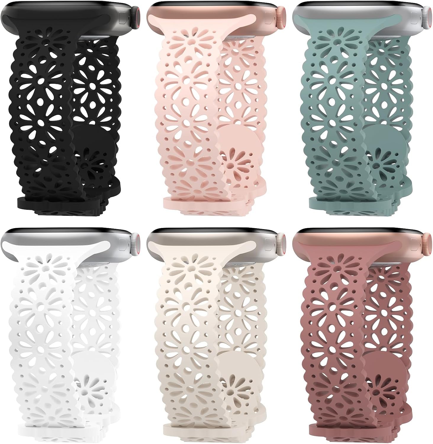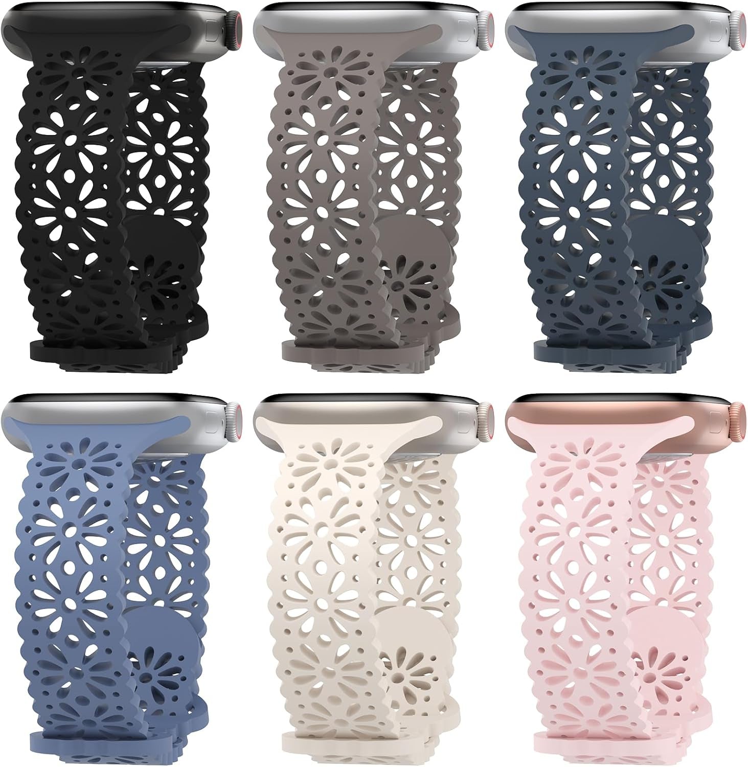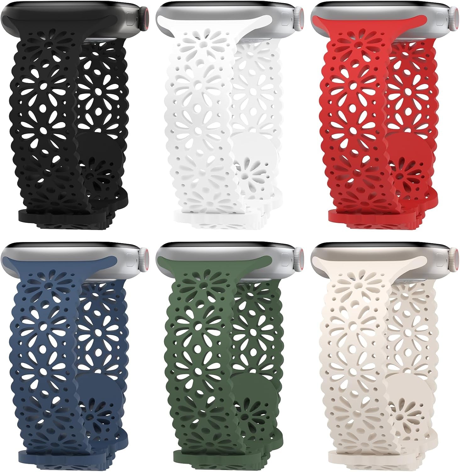 6 Pack Lace Hollow-Out Silicone Bands Compatible with Apple Watch 38Mm 40Mm 41Mm 42Mm 44Mm 45Mm 49Mm, Slim Thin Sport Strap Wristbands for Iwatch Ultra/Ultra 2 SE Series 9/8/7/6/5/4/3/2/1 Women Girls