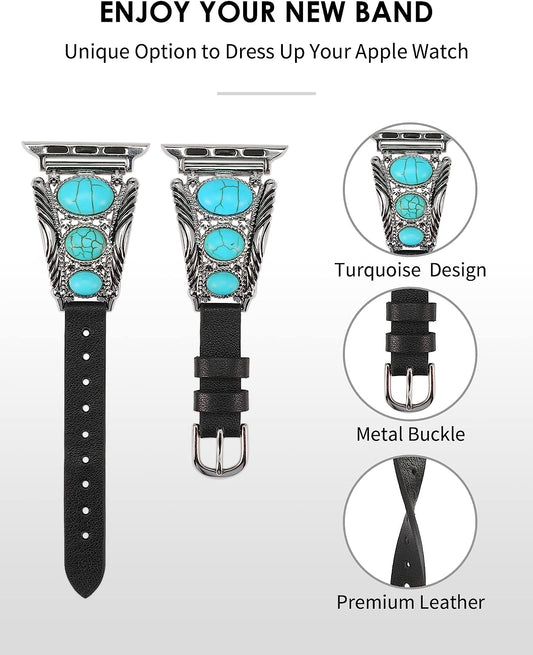 Minyee Leather Band Compatible with Apple Watch Band 49Mm(Ultra) 45Mm 44Mm 42Mm, Turquoise Apple Watch Bands Women, Vintage Boho Ethnic Antique Jewelry Style Strap for Iwatch Series SE/8/7/6/5/4/3/2/1