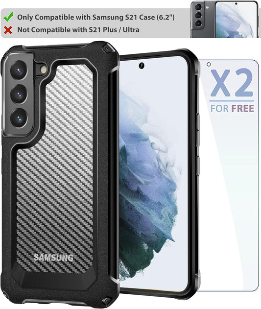 SUPBEC Galaxy S21 Case, Carbon Fiber Shockproof Protective Cover with Screen Protector [X2] [Military Grade Protection] [Scratch Resistant & Anti-Fingerprint], Samsung Galaxy S21 Case, 6.2", Black