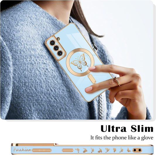 Newseego for Samsung Galaxy S21 5G Magnetic Case, Cute Butterfly Plating Edge Case with Magsafe for Women Girls Men Soft TPU Bumper Shockproof Camera Protective Cover for Samsung Galaxy S21-Blue