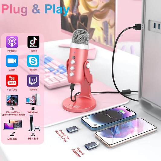 Zealsound Gaming USB Microphone,Pink Microphone with Quick Mute for Phone Computer PC Ps5,Studio Mic with Gain Control,Echo&Monitor Volume Adjust for Streaming Vocal Recording ASMR Podcast Video K66