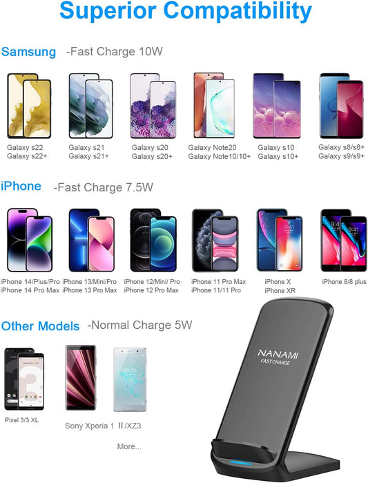 NANAMI Upgraded Fast Wireless Charger,Qi-Certified Wireless Charging Stand Compatible Samsung Galaxy S23/S22/S21/S20/S10/S9 S8/Note 20 Ultra/10/9 & Qi Phone Charger for Iphone 14/13/12/SE/11/XR/XS/X/8
