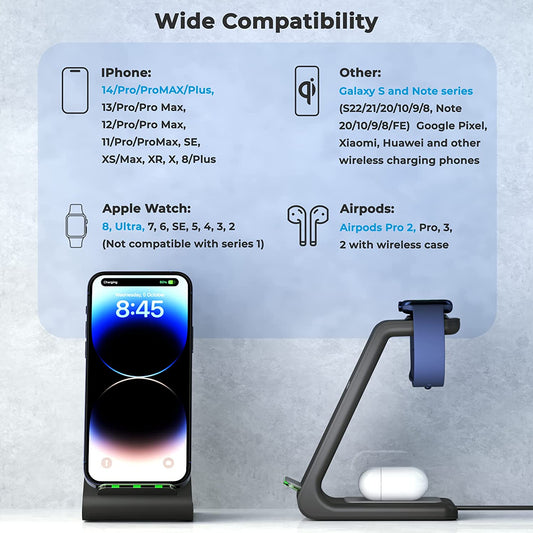Quezqa Wireless Charging Stand - Fast Wireless Charger - 3 in 1 Charging Station for Apple Airpods Pro 3 2 Apple Watch Ultra 8 7 SE 6 5 4 Iphone 14 Pro Max 14 plus 13 12 11 Pro Max with QC3.0 Adapter