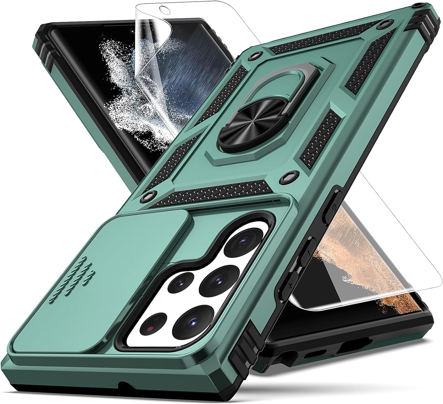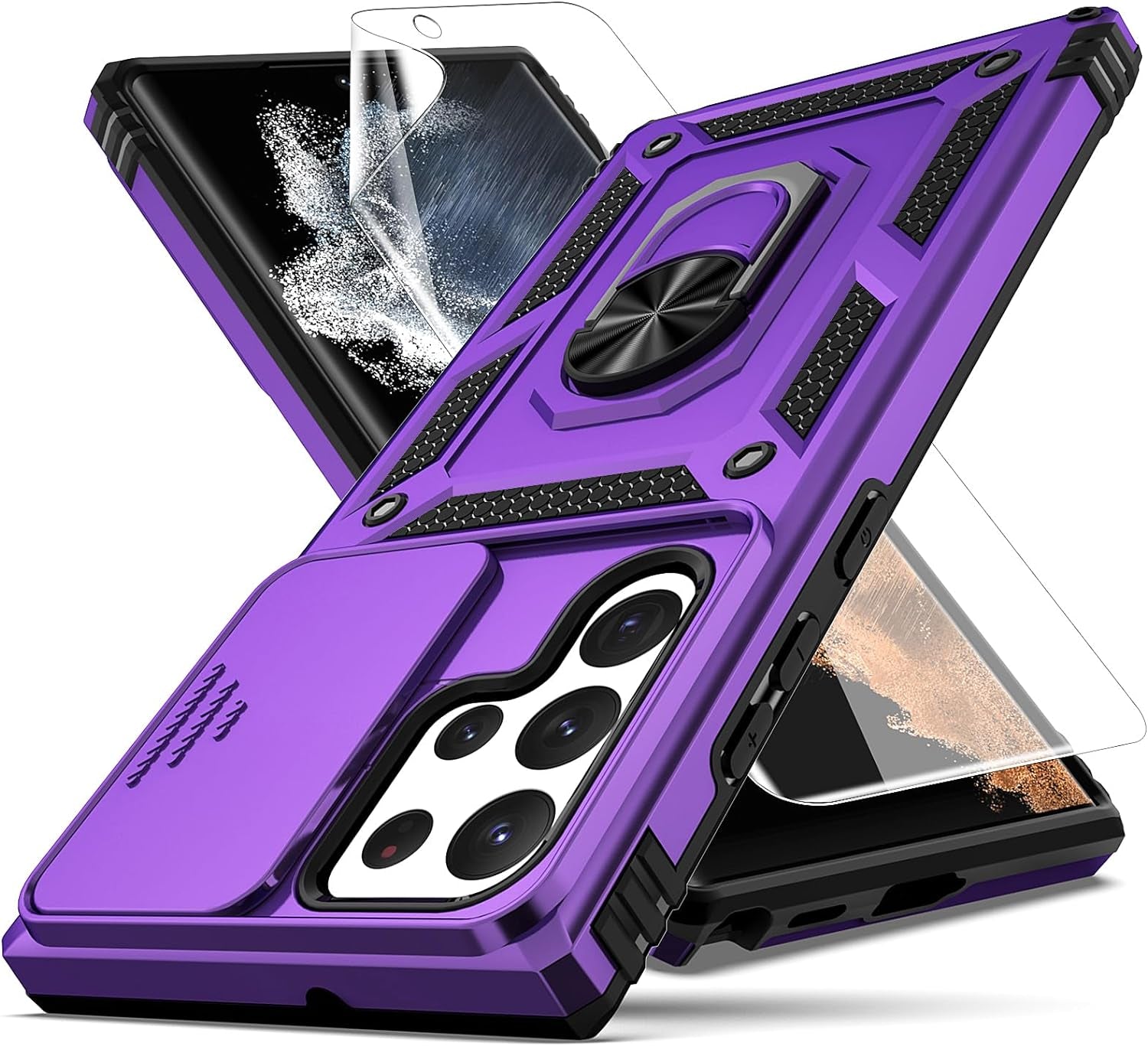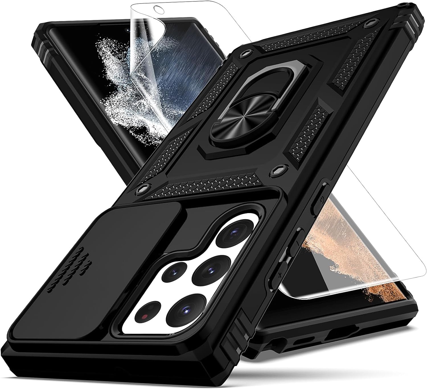 • 📱【Durable Phone Case】Armor Case with sliding camera cover specially designed for Samung Galaxy S22 Ultra 6.8 inch (2022 released). ⚠️ Notice: Due to the metal ring on the back,the case will NOT work with wireless Charging function.