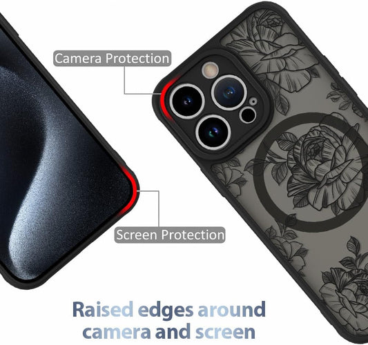AIGOMARA Case for Iphone 15 Pro [Compatible with Magsafe] Black Flower Floral Pattern Design Case for Women Girls Soft TPU Bumper Hard PC Back Anti-Fall Shockproof Protective Slim Magnetic Cover