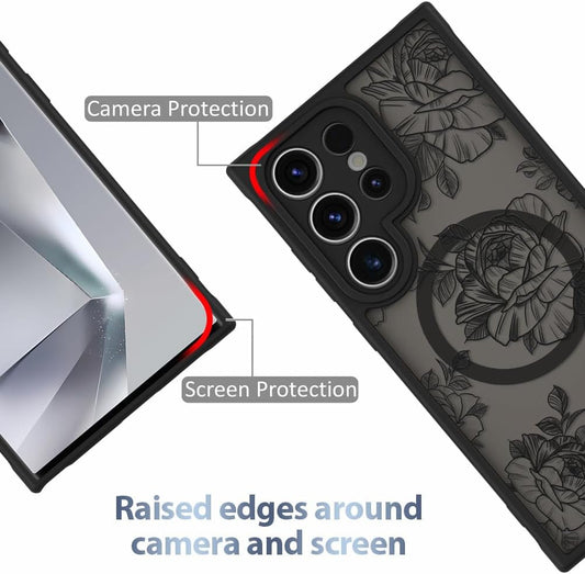 AIGOMARA Magnetic Case for Samsung Galaxy S24 Ultra [Compatible with Magsafe] Black Flower Floral Pattern Case for Women Girls Soft TPU Bumper Hard PC Back Anti-Fall Shockproof Protective Slim Cover