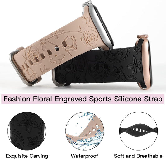 Flower Engraved Bands Compatible with Apple Watch Band 41Mm 40Mm 38Mm 44Mm 42Mm 45Mm 49Mm, Cute Women Floral Soft Silicone Sport Replacement Strap for Iwatch Series Ultra SE 8 7 6 5 4 3 2 1