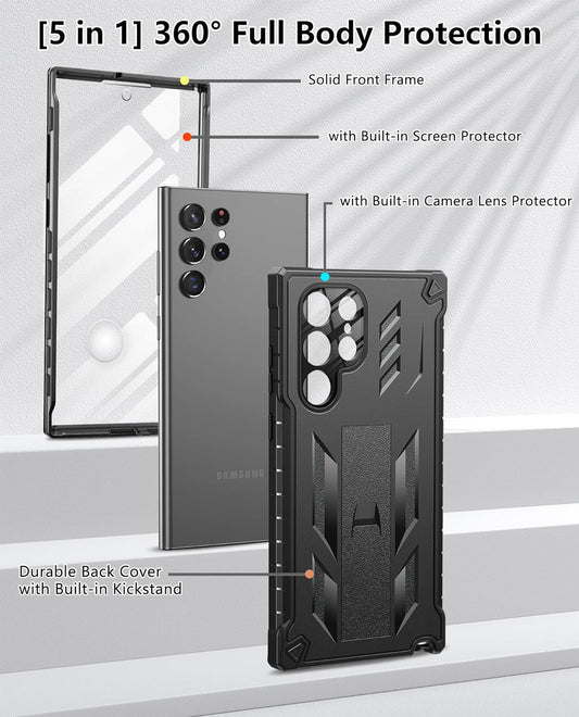 FNTCASE for Samsung Galaxy S22 Ultra Case: Built-In Screen Protector & Kickstand Full-Body Dual Layer Rugged Military Grade Shockproof Protection Heavy Duty Protective Phone Cover 5G-Black