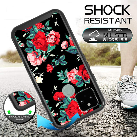 MGAH Pixel 5 Case with Roses Design,Google Pixel 5 Phone Case,Hybrid Triple Layer Armored Protective Cover Flexible Sturdy Anti-Scratch Shockproof Bumper Cute Case for Women and Girls-Flowers/Black