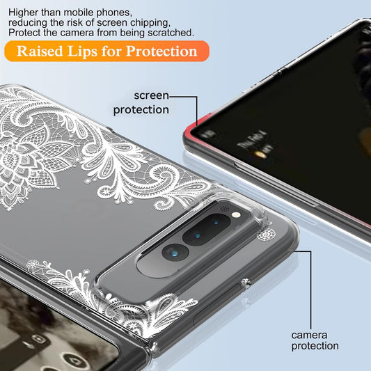 Osophter for Google Pixel Fold 5G Case Clear: Flower Floral for Girls Women Shock-Absorption Transparent Back Cell Phone Cover Cases for Google Pixel Fold 5G(White Lace)